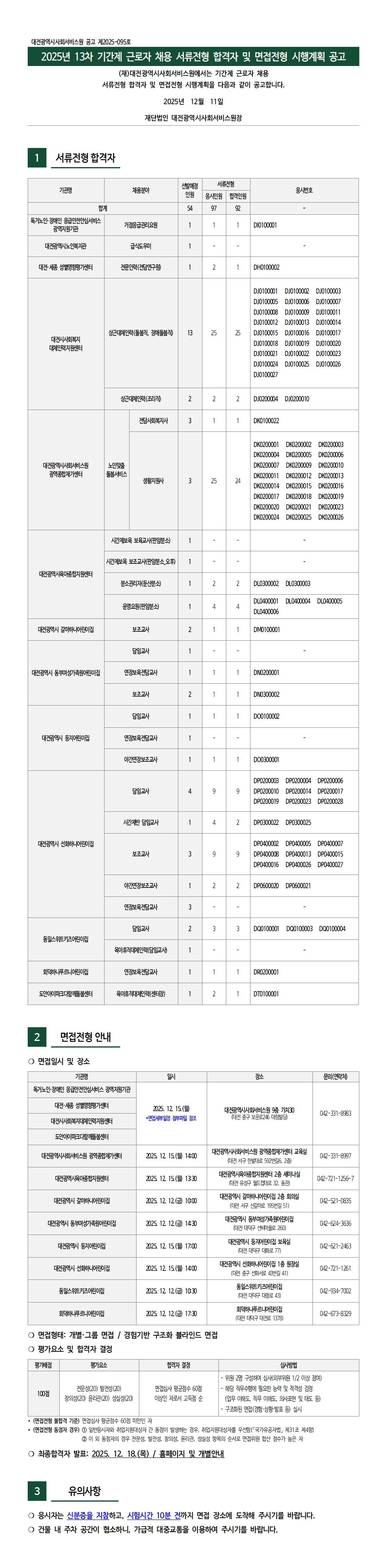 [제2025-095호] 2025년 13차 기간제 근로자 채용 서류전형 합격자 및 면접전형 시행계획 공고